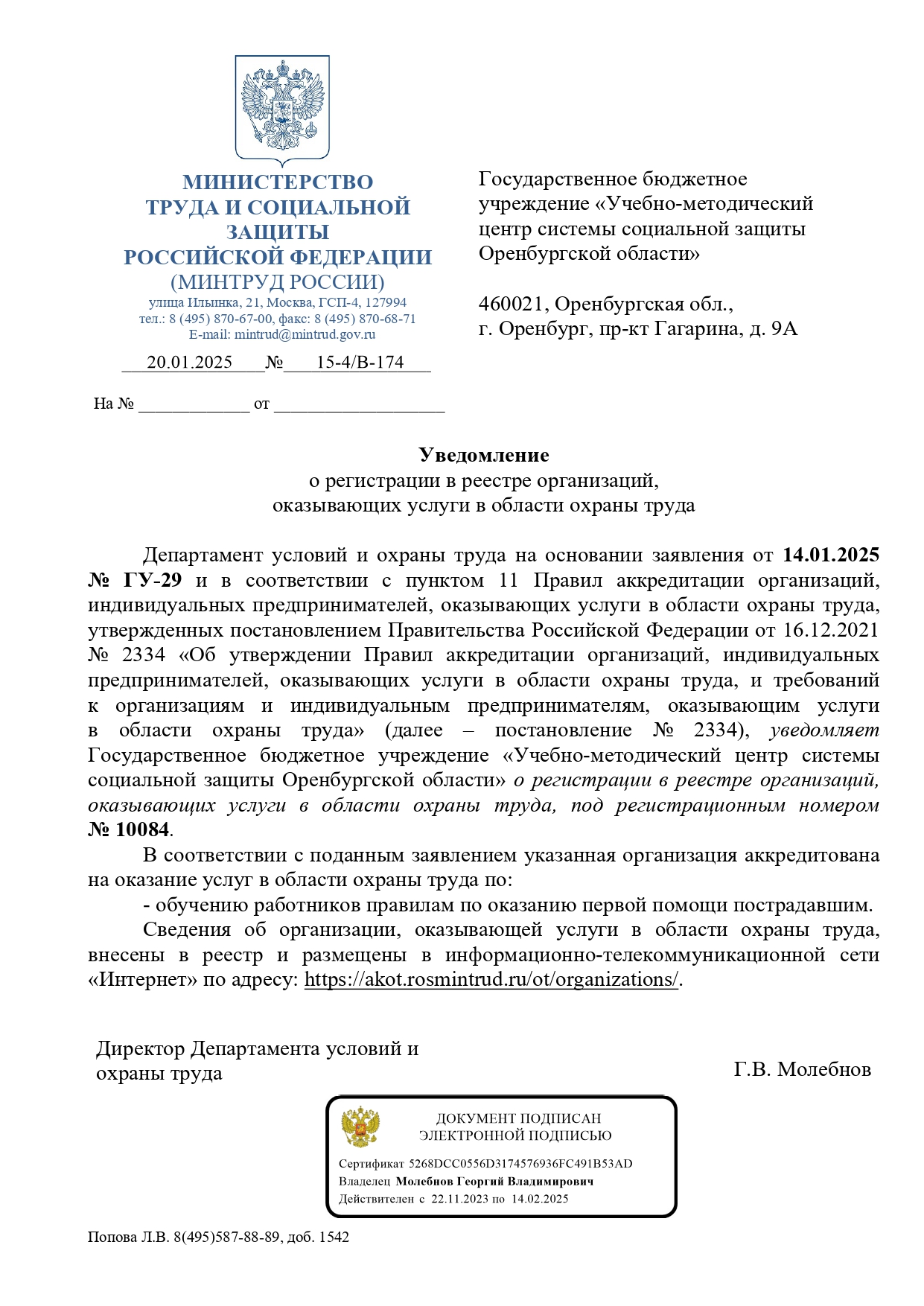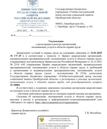 Уведомление о регистрации в реестре организаций, оказывающих услуги в области охраны труда
